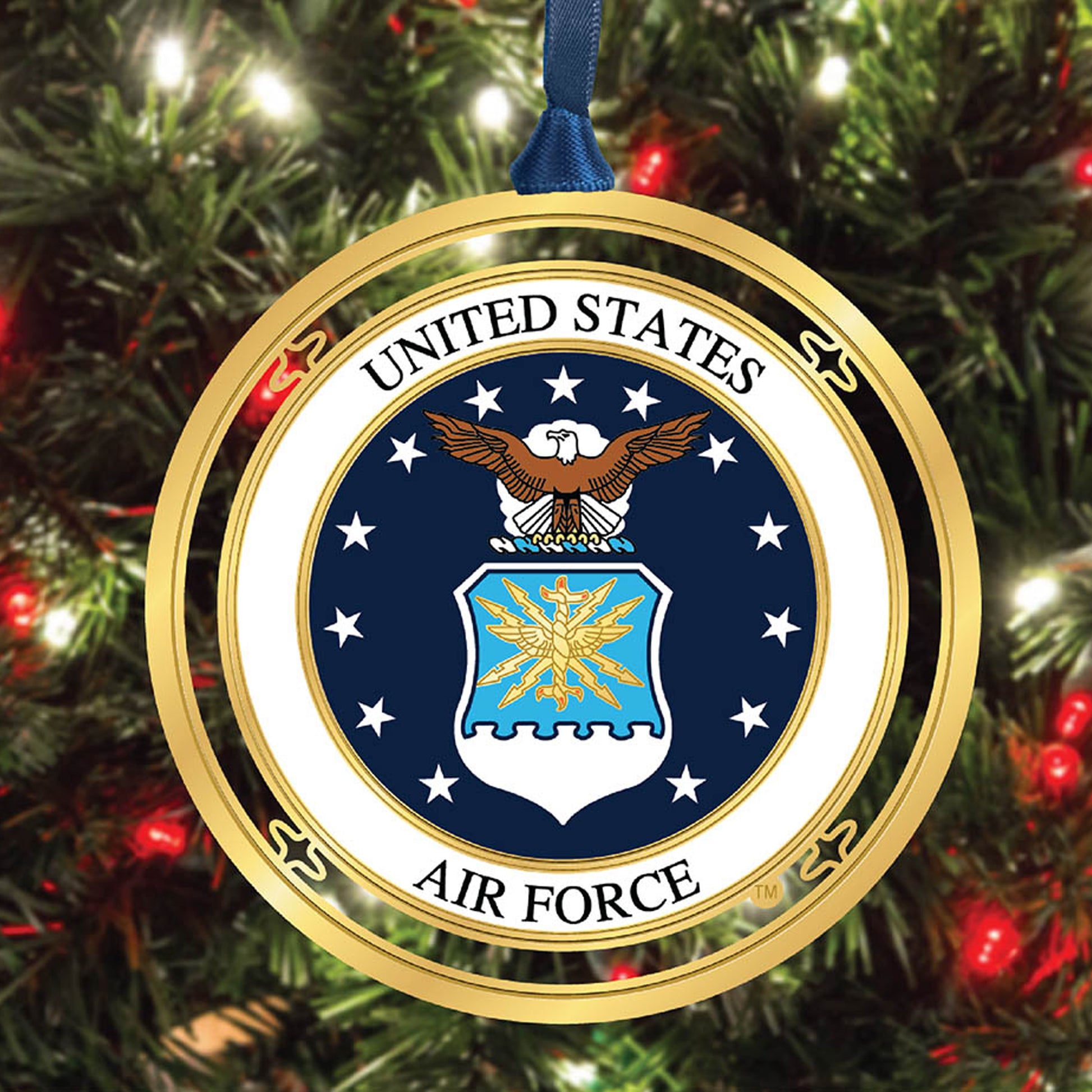 This ornament elegantly showcases the Seal of the United States Air Force, outlined and highlighted with gold.