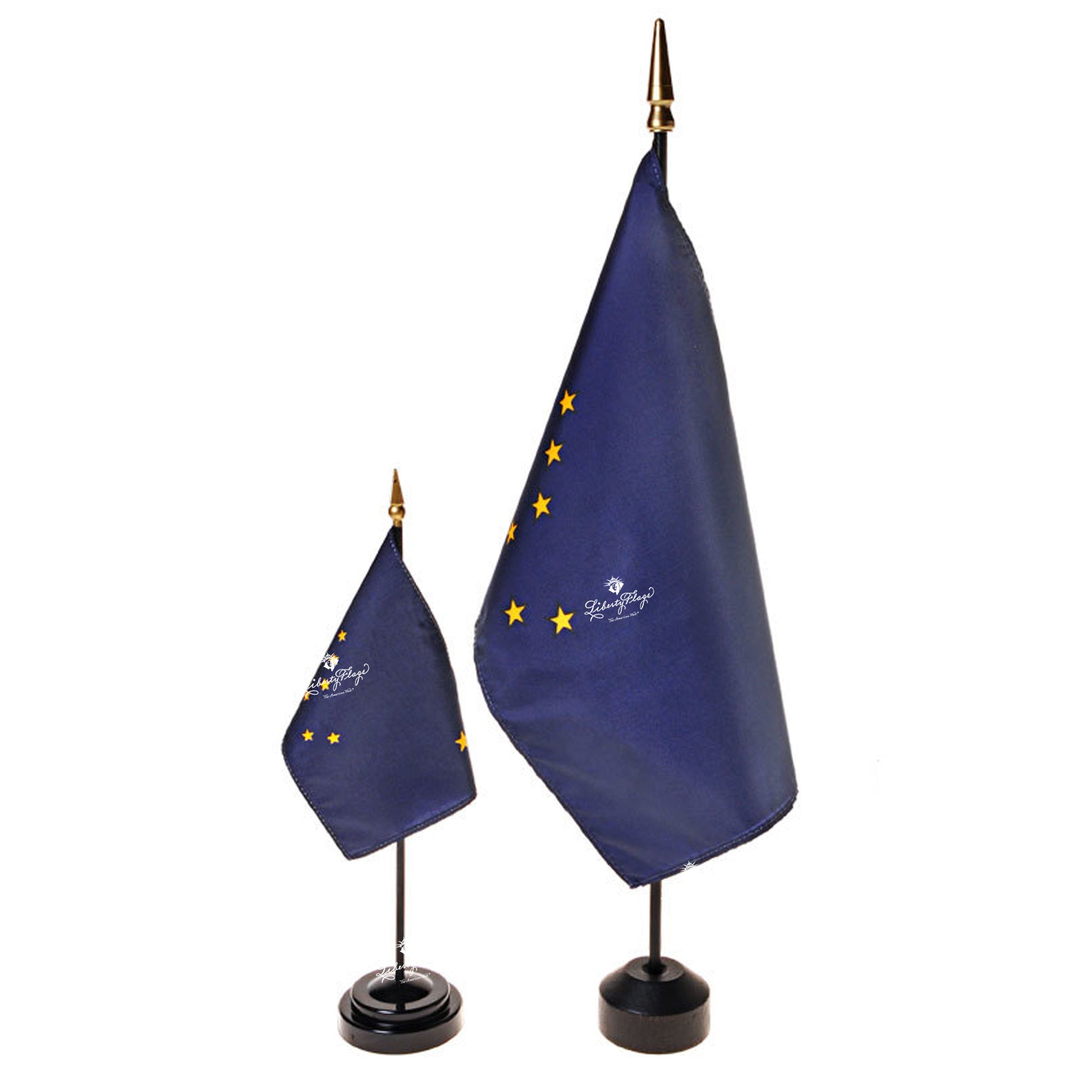 Premium quality hemmed polyester fabric Alaska flags securely stapled to a black dowel staff topped with gilt spear ornament and supplied with black display base.
