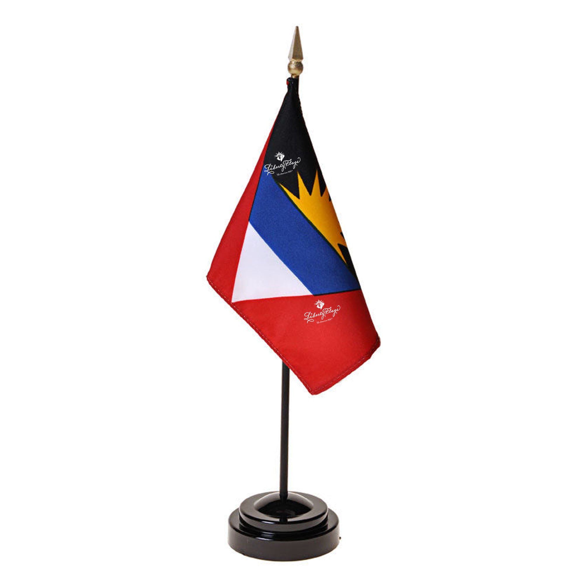 Premium quality hemmed polyester fabric Antigua and Barbuda flags securely stapled to a black dowel staff topped with gilt spear