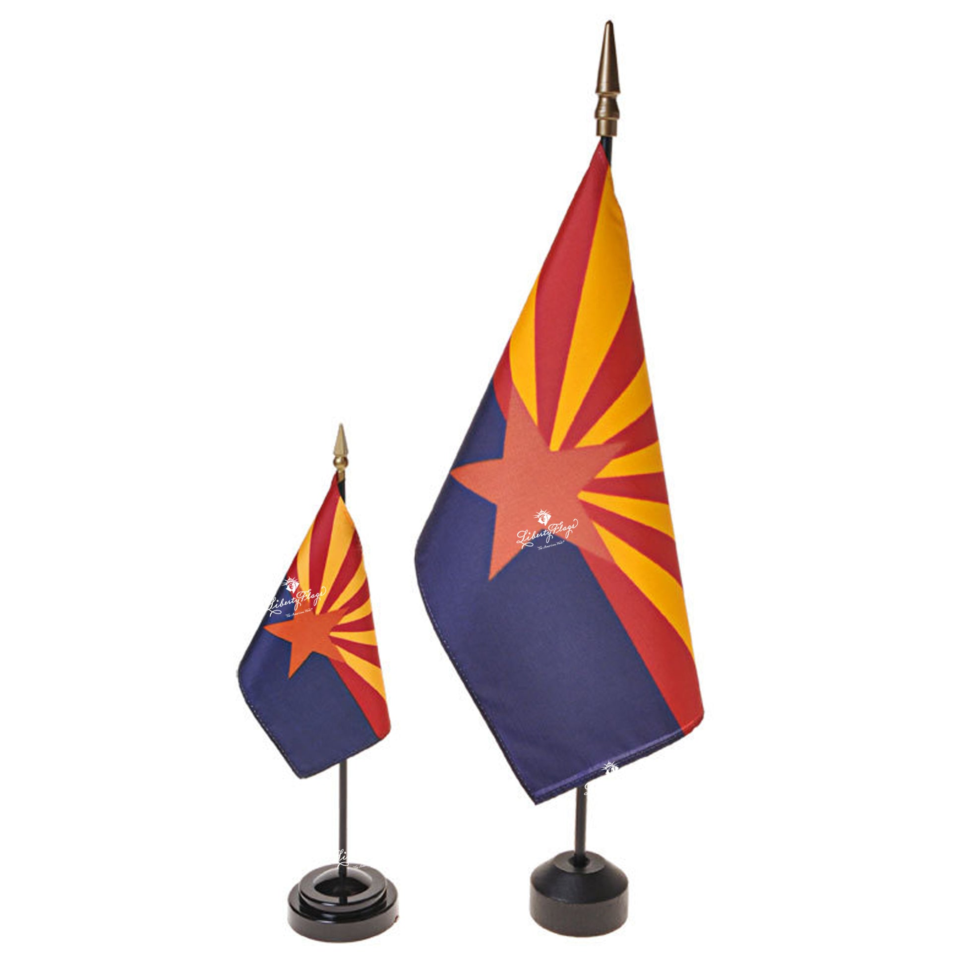 Premium quality hemmed polyester fabric Arizona flags securely stapled to a black dowel staff topped with gilt spear ornament and supplied with black display base.