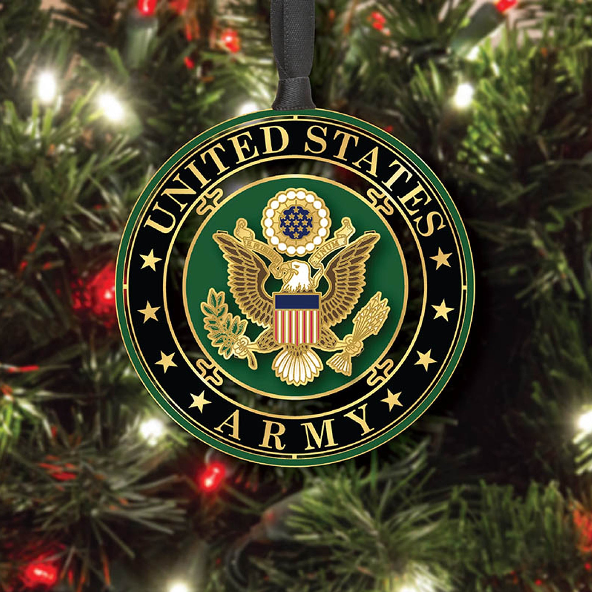 This ornament elegantly showcases the Seal of the United States Army, outlined and detailed with gold.