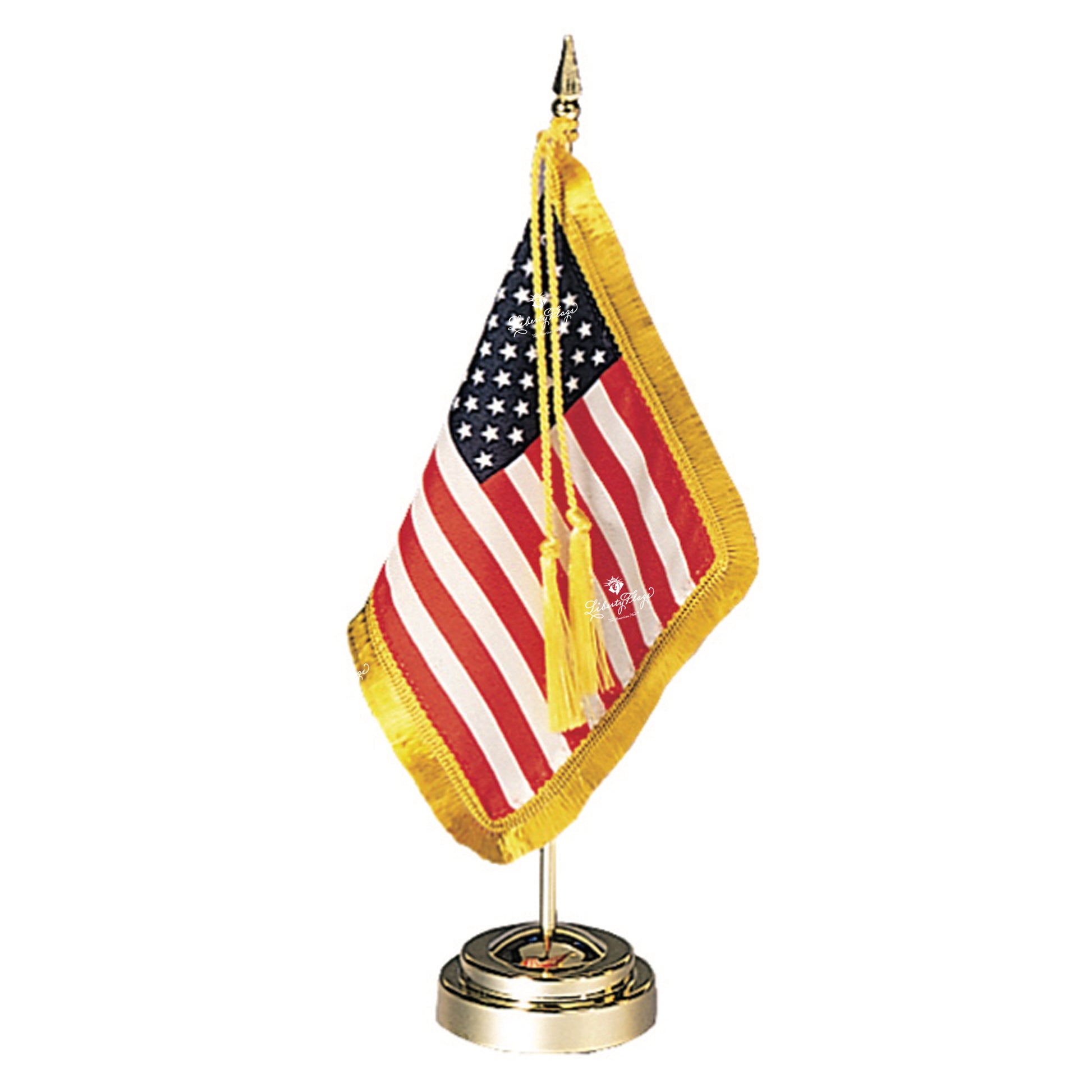 - 4"x6" printed polyester American Flag trimmed in golden yellow fringe