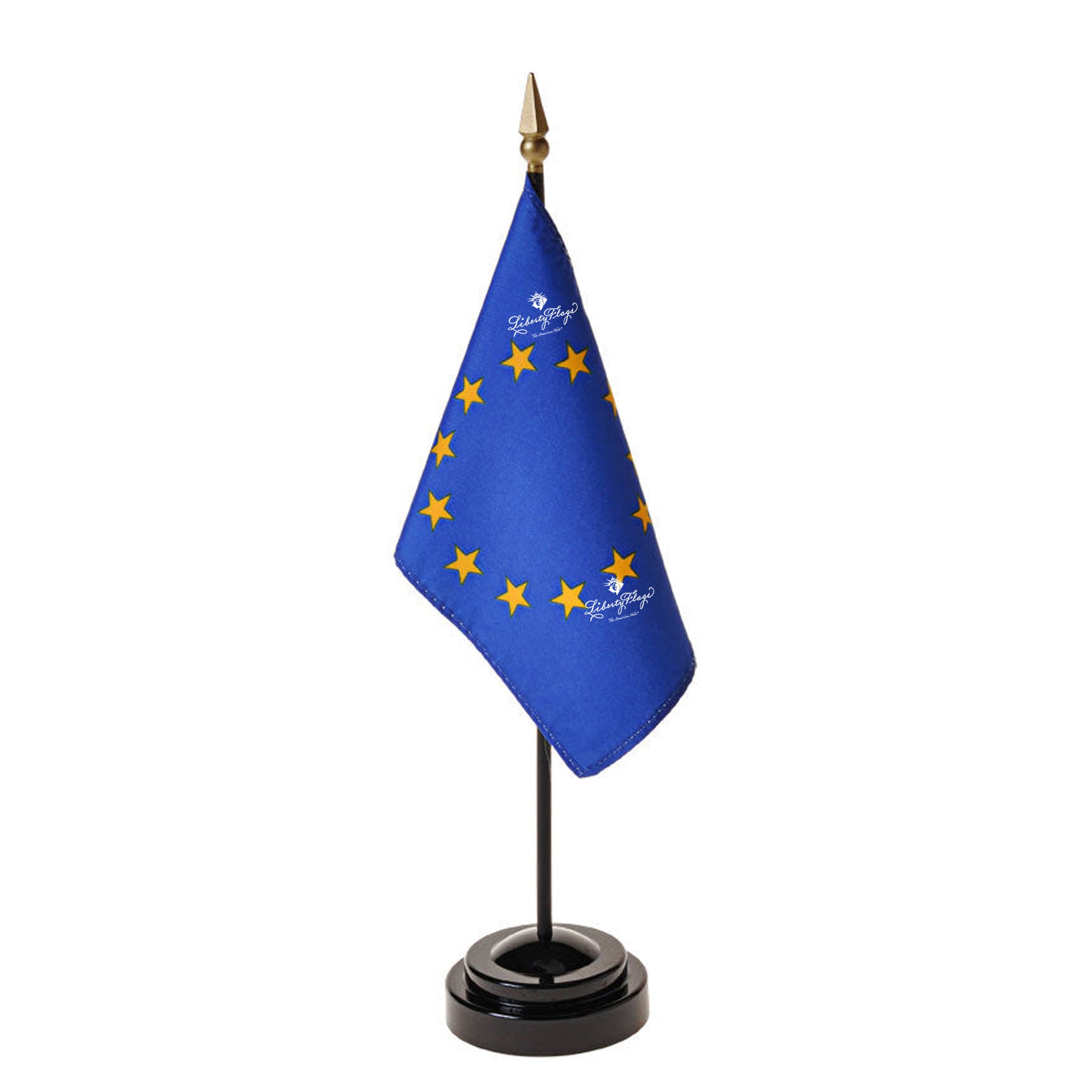 Premium quality hemmed polyester fabric European Union flags securely stapled to a black dowel staff topped with gilt spear ornament and supplied with black display base.