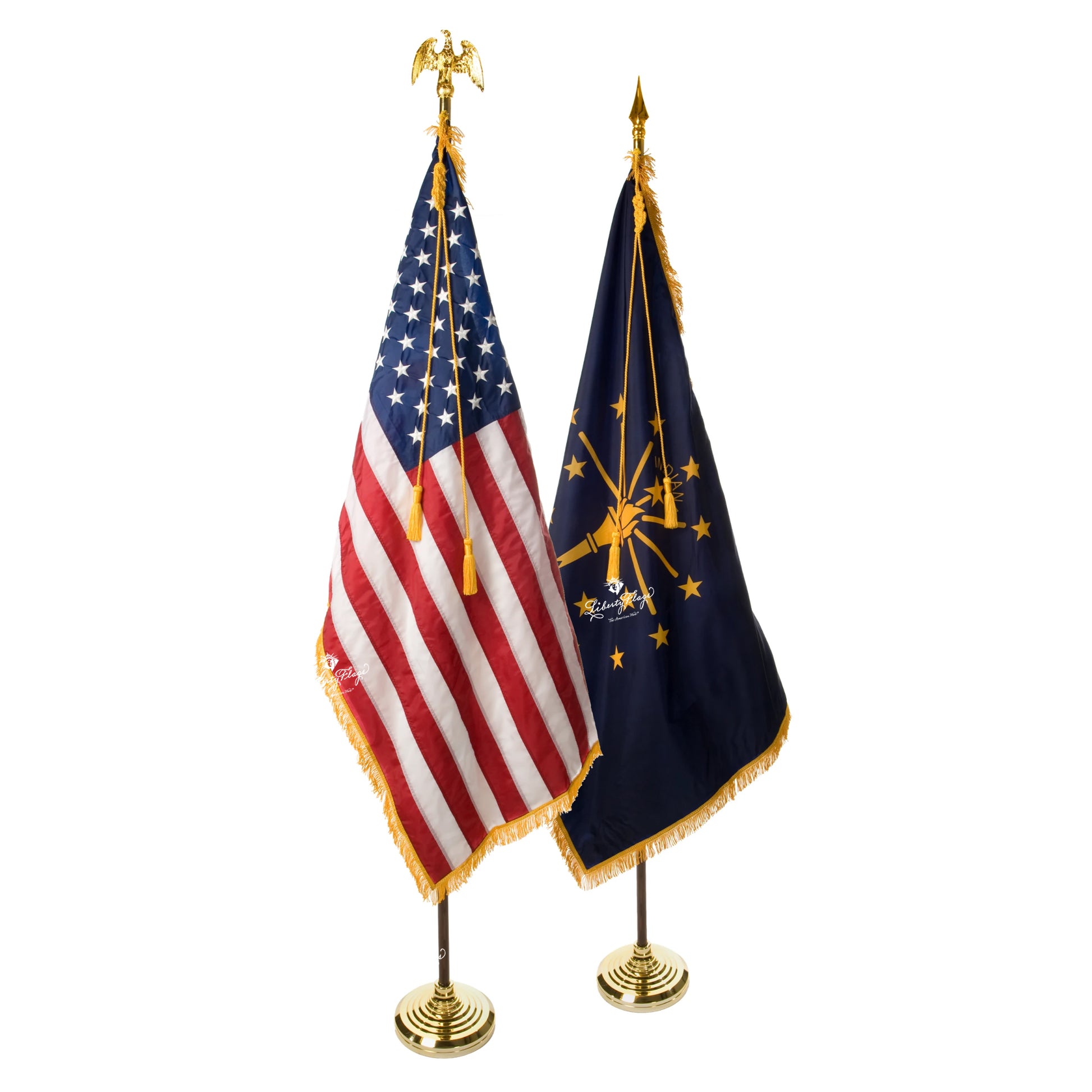 One pair, everything you need! These ceremonial pairs include an American flag and an Indiana flag with display hardware including ornaments, braided cords with tassels, furniture-grade finish hardwood poles and attractive floor stands.
