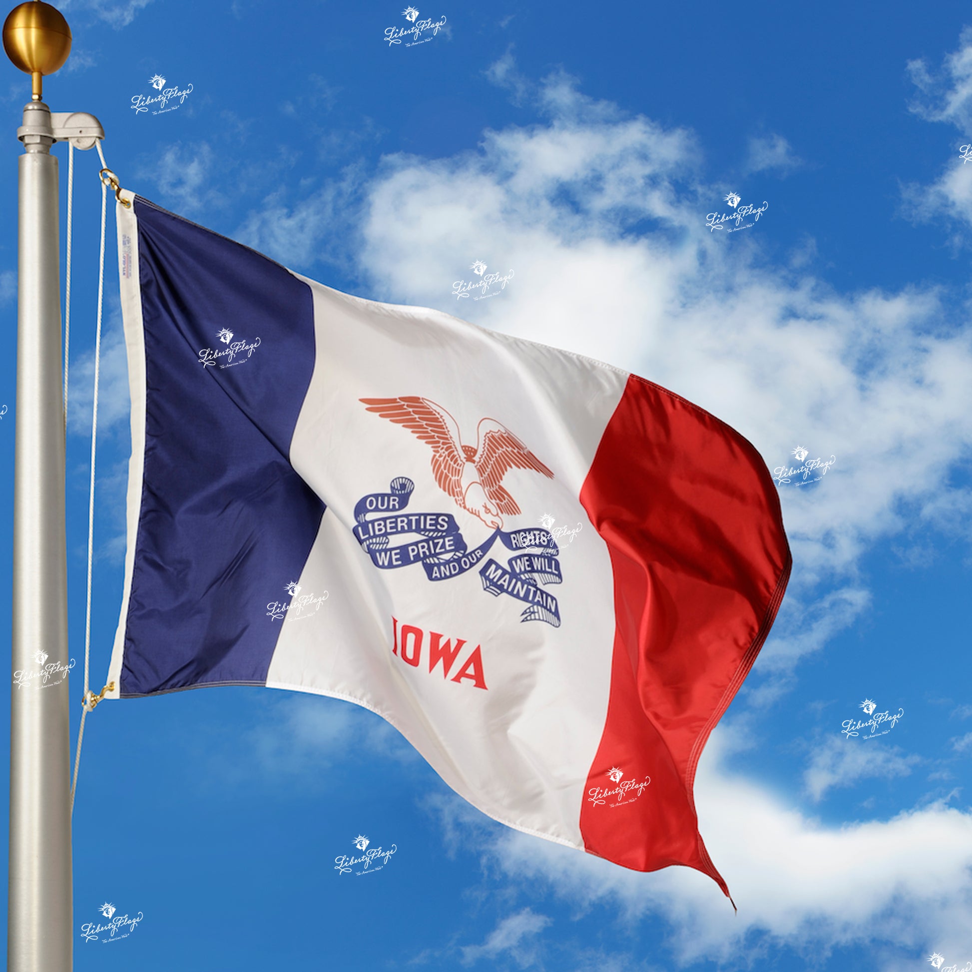 Known for strength and durability, Liberty Flags’ Polyester Iowa flag is made with double ply polyester fabric weighing about 30% more than the standard nylon flag bunting. The unique fabric weave allows some wind to pass through the fabric as the flag flies in the wind making it the best performing flag for high wind and extreme weather conditions.