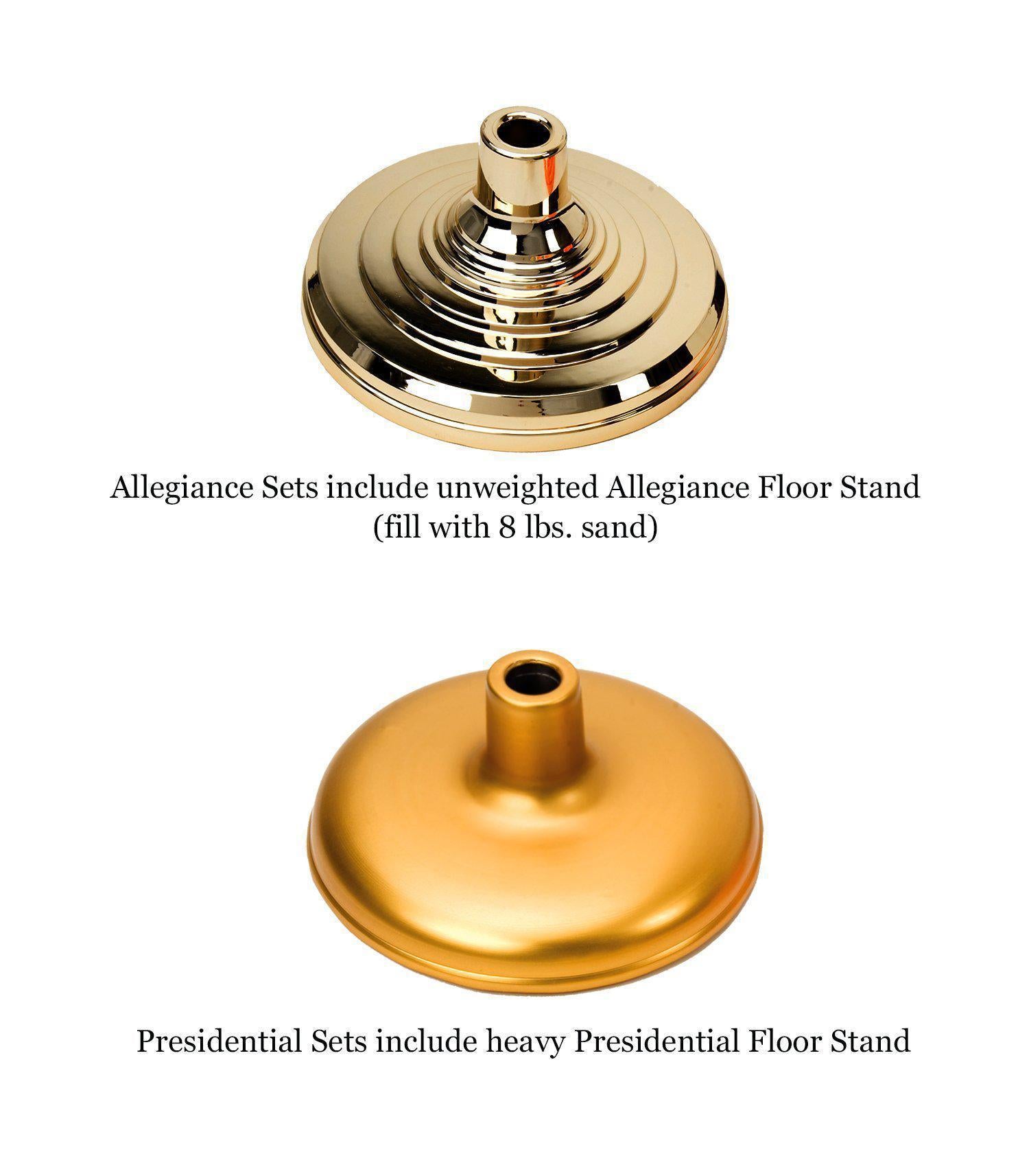 - Standard quality Allegiance pair supplied with ABS styrene ornament, vacuum metalized Allegiance ABS floor stands (fill with sand on receipt). Size options: 3’x5’ fringed nylon flags on 8’ poles OR 4’x6’ fringed nylon flags on 9’ poles.