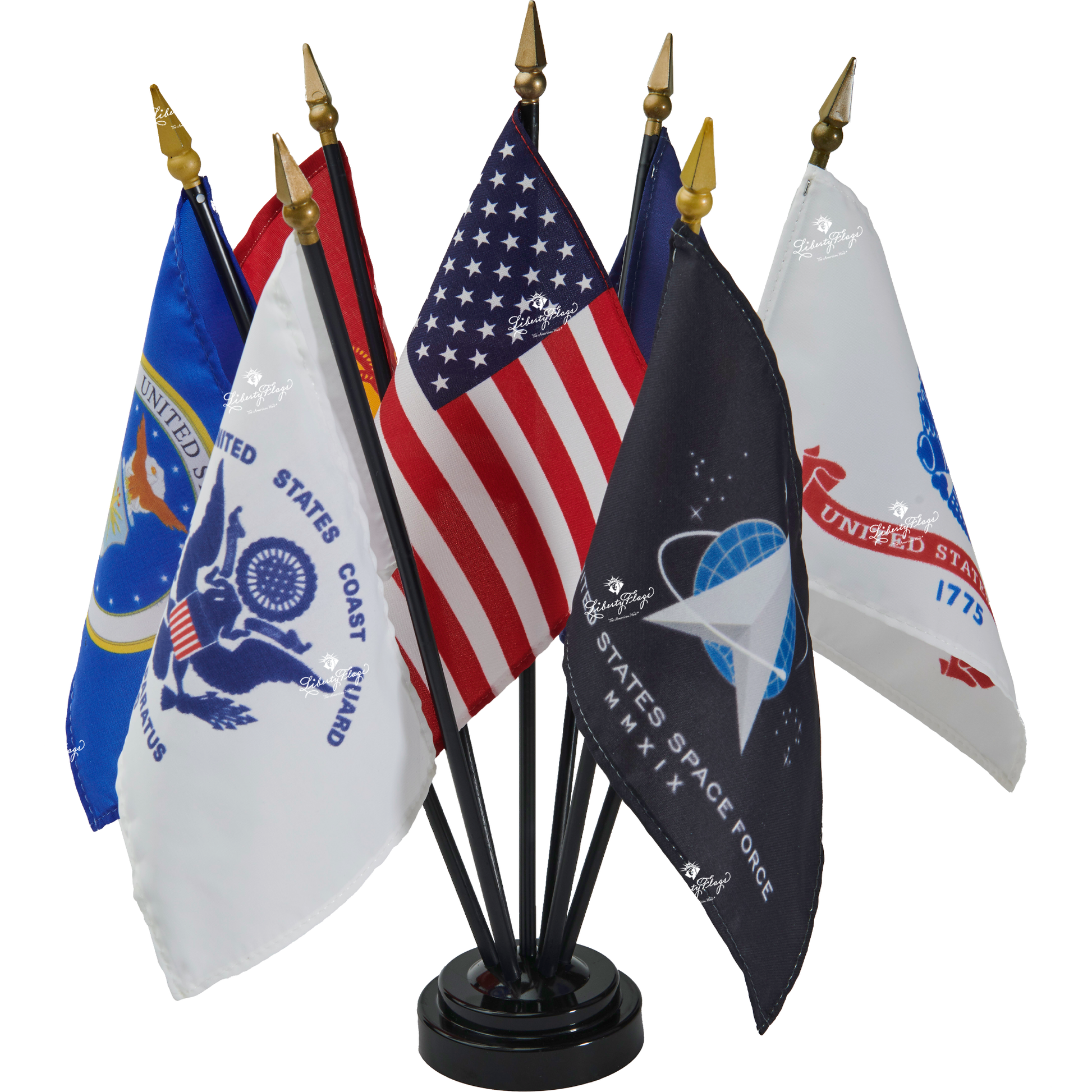 Set includes 7 flags: American, Army, Marine Corps, Navy, Air Force, Coast Guard and Space Force each mounted on 10"x3/16" black staff with 7-hole black plastic base