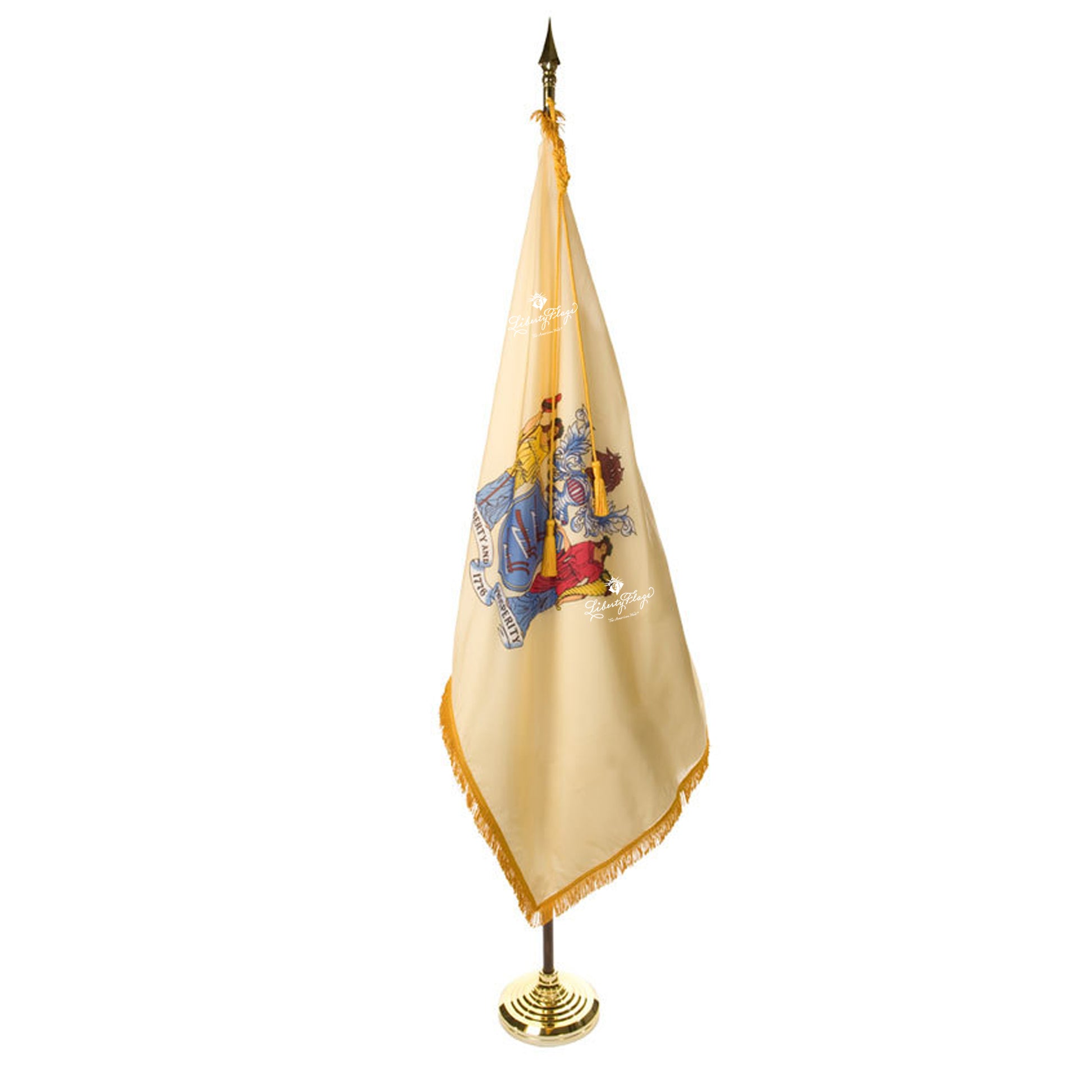 Boardroom to courtroom, set the stage or parade with the finest quality ceremonial New Jersey flags and accessories available. Ceremonial flags can be purchased alone or with display set. Two sizes and two set options exist.