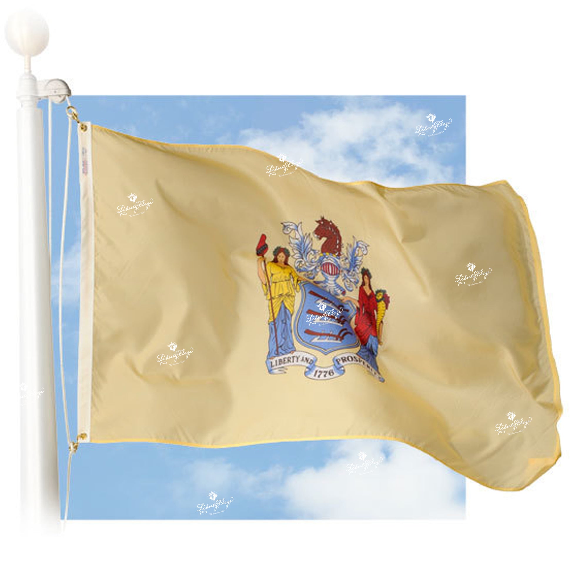 The state of New Jersey flag features the New Jersey coat of arms and light blue ribbon including the state motto “Liberty and Prosperity” atop a buff color field. New Jersey legislature adopted the flag design March 26, 1896 – 109 years after New Jersey Statehood (December 18, 1787).