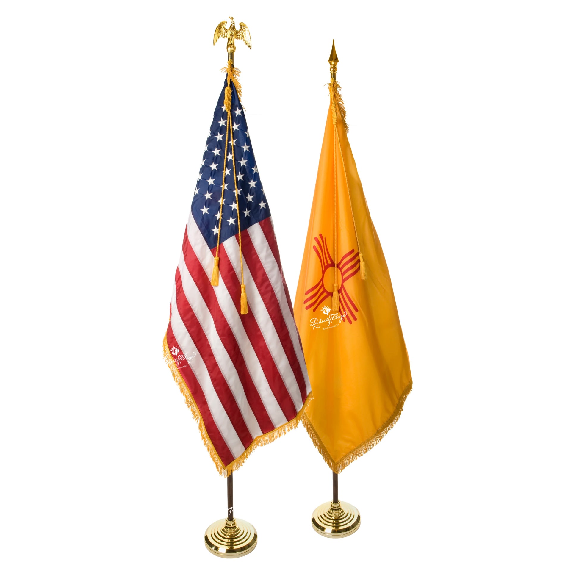 One pair, everything you need! These ceremonial pairs include an American flag and a New Mexico flag with display hardware including ornaments, braided cords with tassels, furniture-grade finish hardwood poles and attractive floor stands.