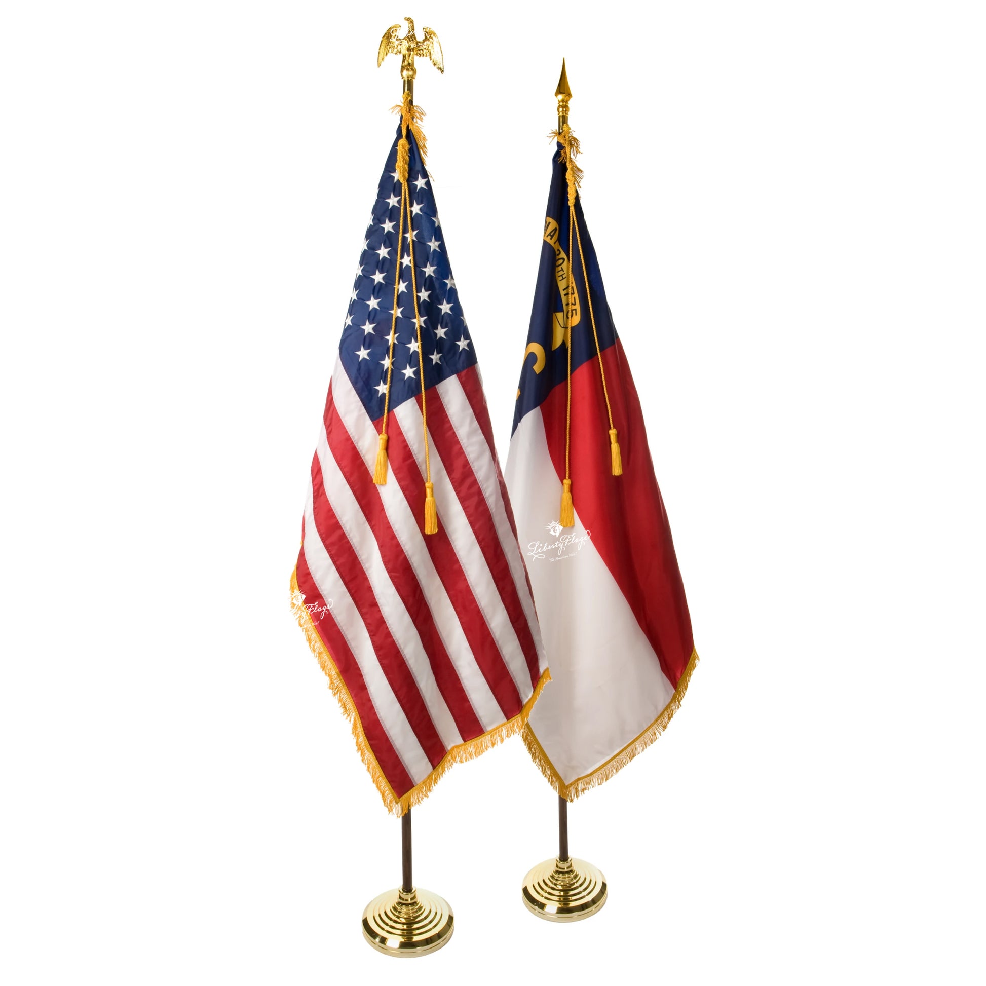 One pair, everything you need! These ceremonial pairs include an American flag and a North Carolina flag with display hardware including ornaments, braided cords with tassels, furniture-grade finish hardwood poles and attractive floor stands.