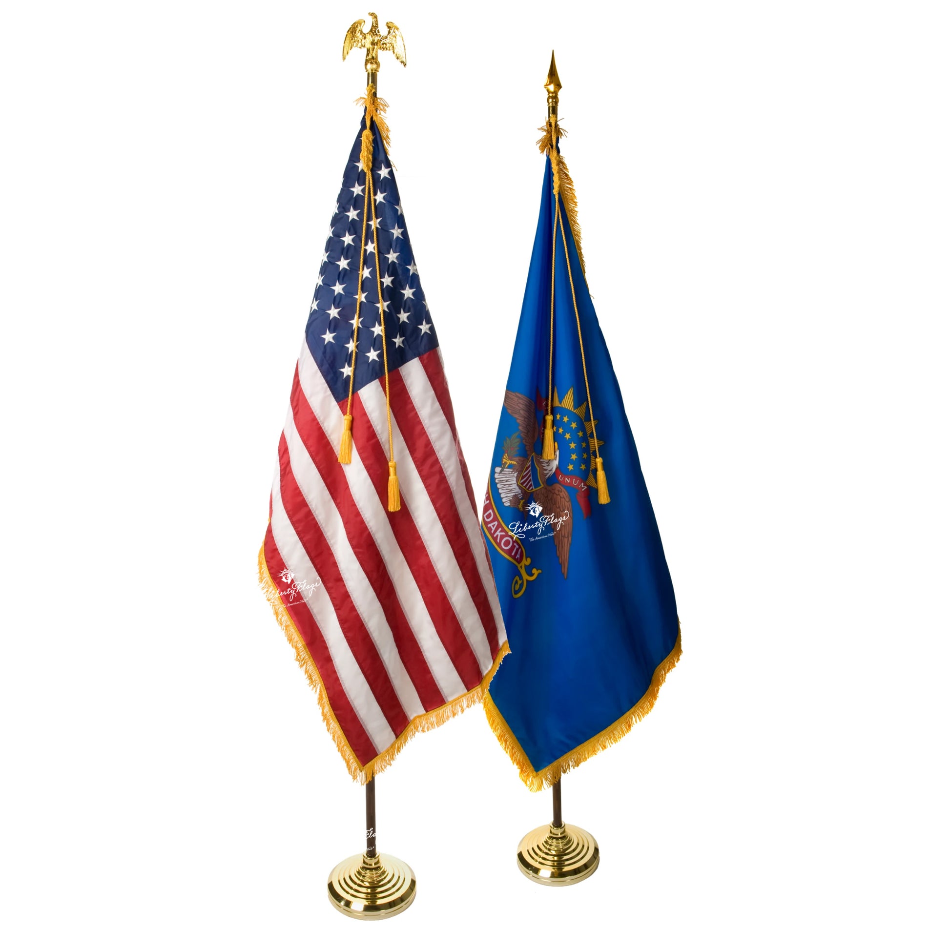 One pair, everything you need! These ceremonial pairs include an American flag and a North Dakota flag with display hardware including ornaments, braided cords with tassels, furniture-grade finish hardwood poles and attractive floor stands.