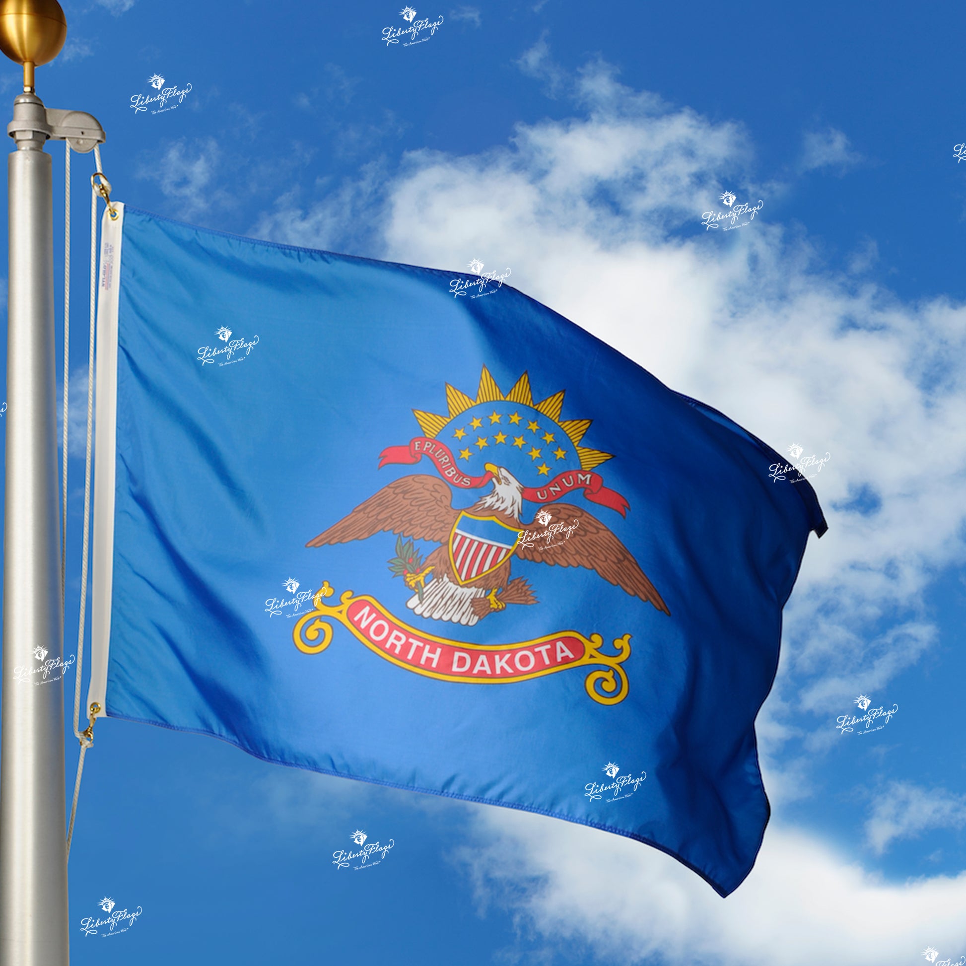 Liberty Flags’ Polyester North Dakota flag is made from 2x2-ply spun and woven polyester fabric. This fabric is approximately 30% heavier than nylon and the unique fabric weave allows some air to pass through the flag as it flies in the wind. Best performing in high winds and extreme weather.