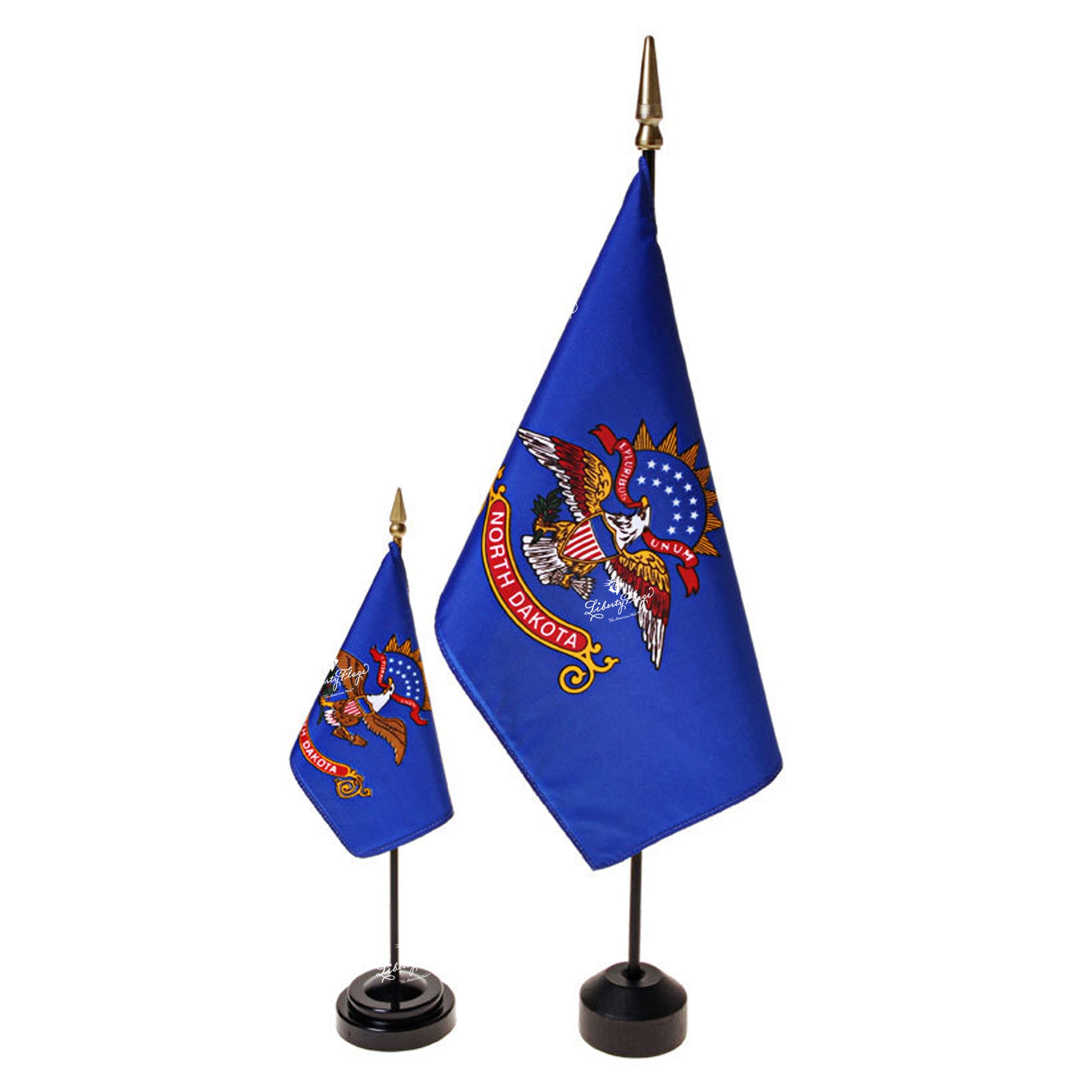 Premium quality hemmed polyester fabric North Dakota flags securely stapled to a black dowel staff topped with gilt spear ornament and supplied with black display base.