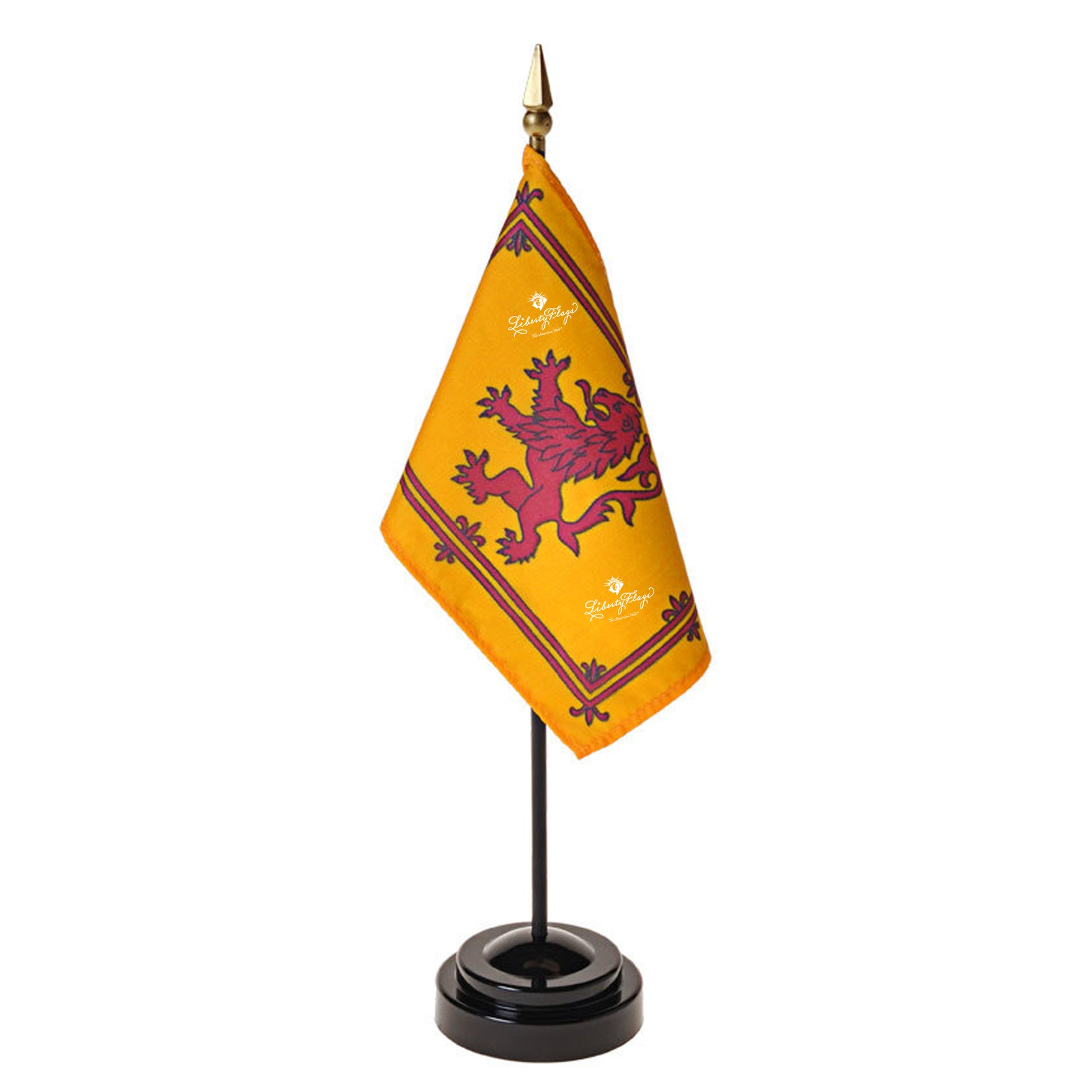 Premium quality hemmed polyester fabric Scottish Rampant Lion flags securely stapled to a black dowel staff topped with gilt spear ornament and supplied with black display base.