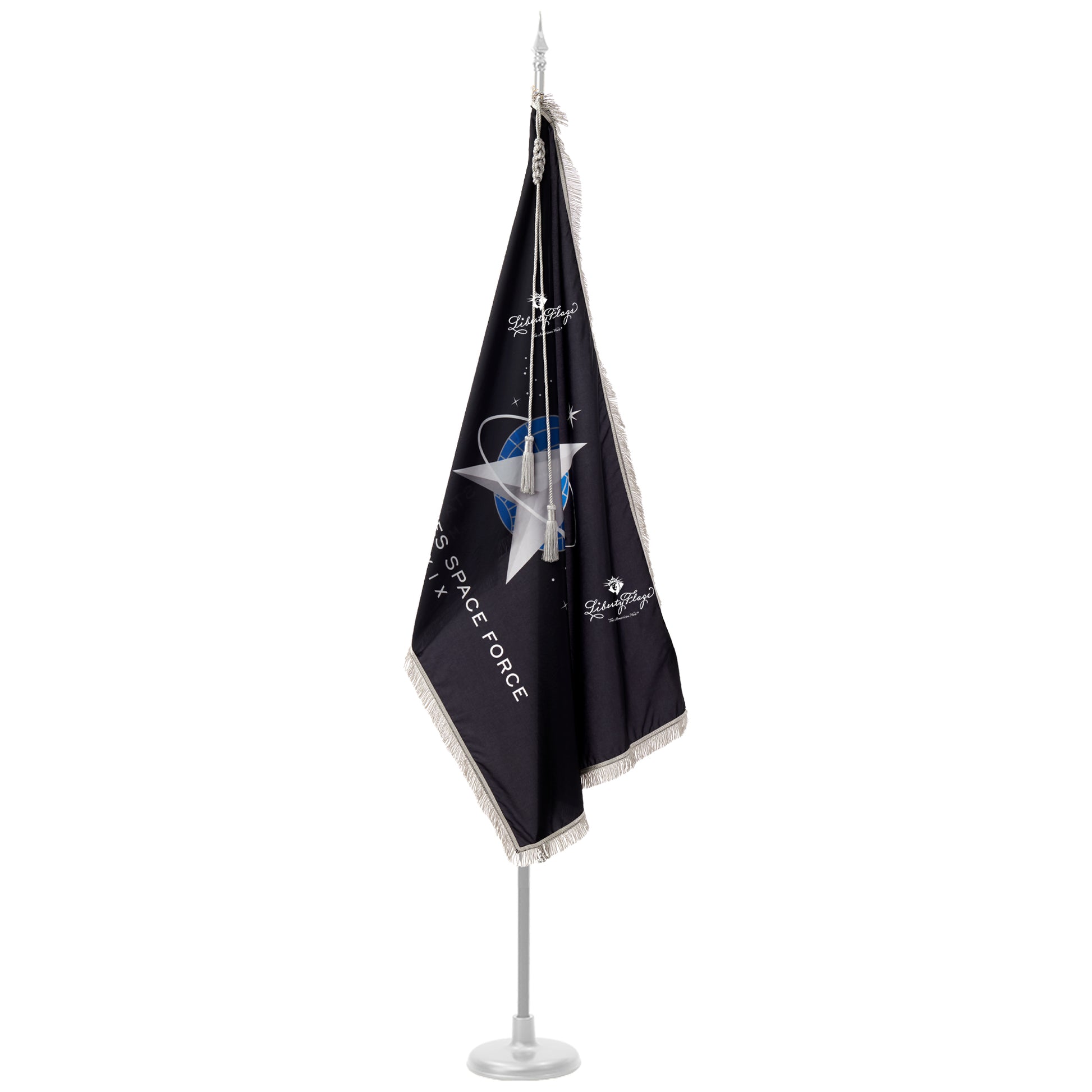 The official Space Force logo is centered on a black background. The flag is derived from the central and supporting elements of the Space Force seal, including the delta wing, globe, elliptical orbit, Polaris star, and star clusters. Beneath the central imagery "UNITED STATES SPACE FORCE" and "MMXIX" in white lettering, indicating the name and birth year of the service.