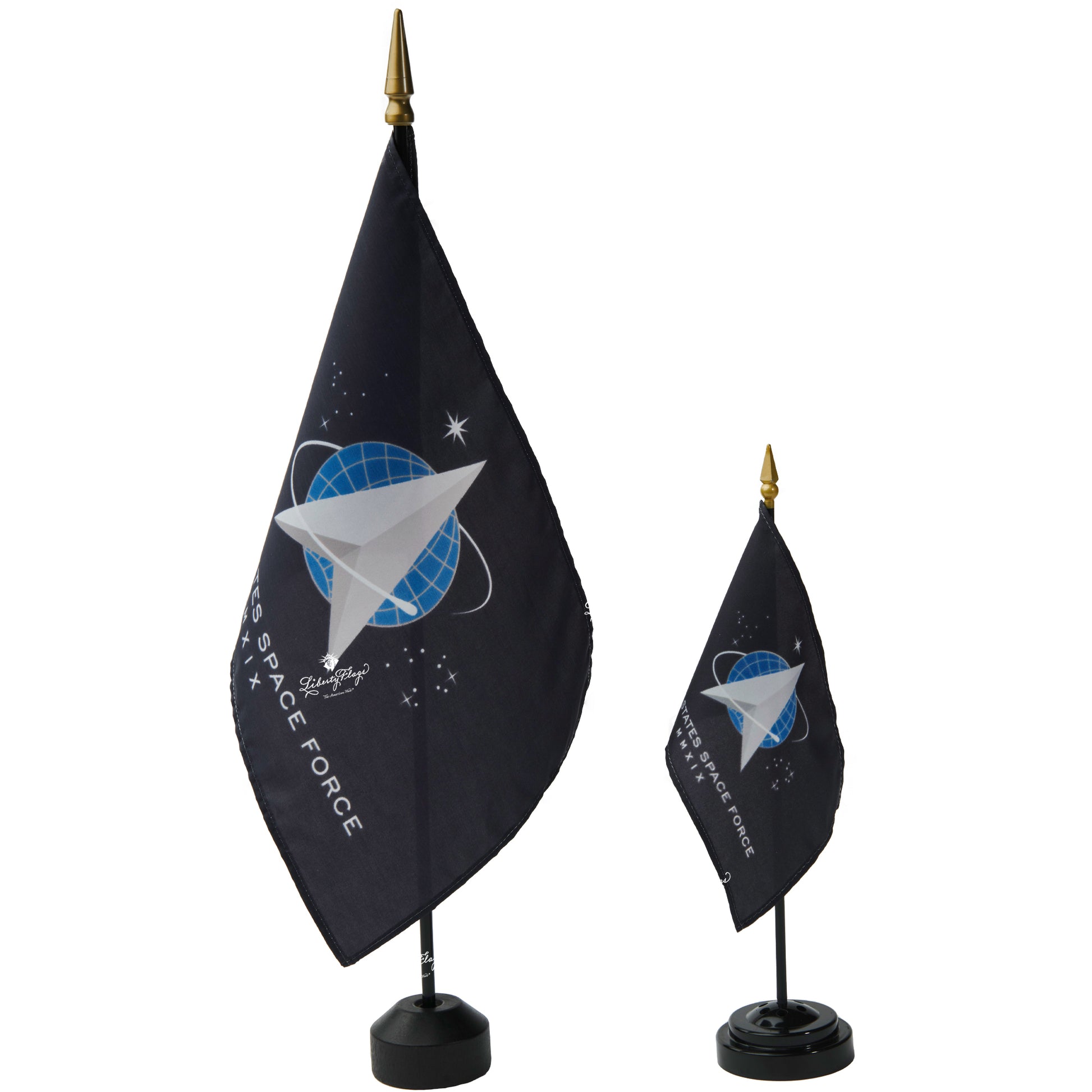 Premium quality hemmed polyester fabric Space Force flags stapled to a black dowel staff topped with gilt spear ornament. Order with or without the display base.