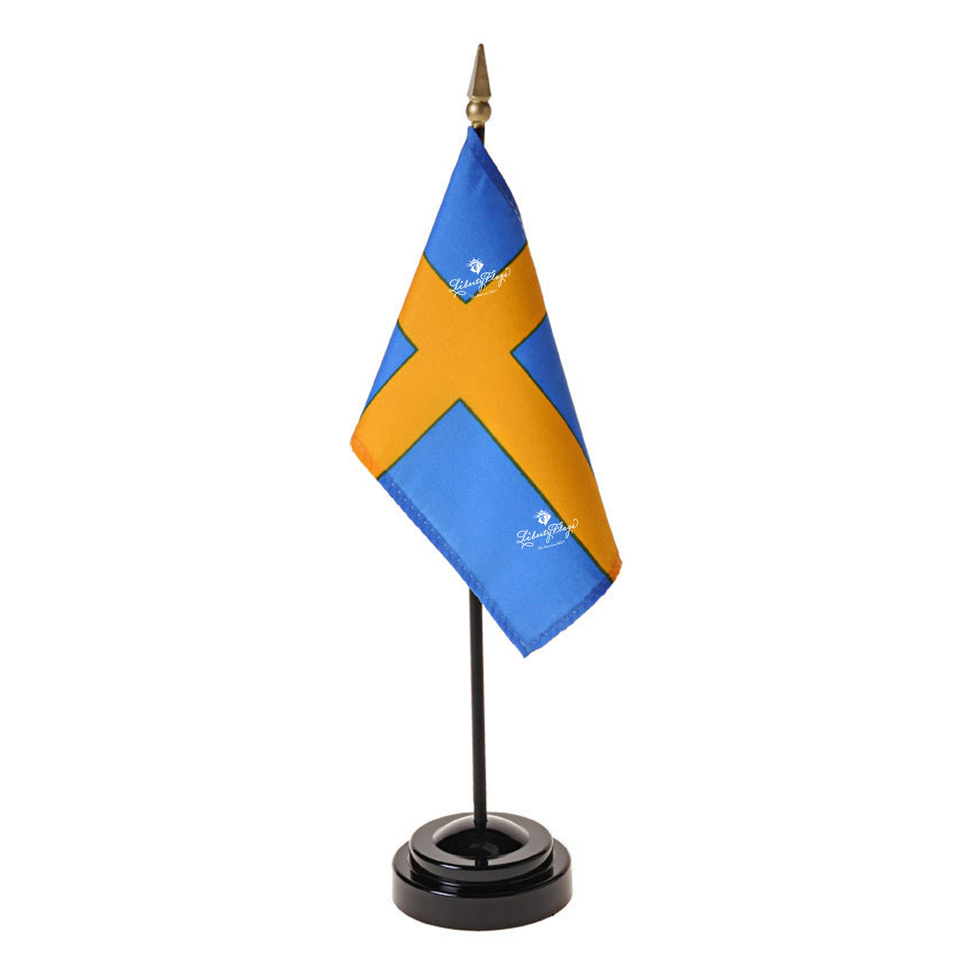 Premium quality hemmed polyester fabric Sweden flags securely stapled to a black dowel staff topped with gilt spear ornament and supplied with black display base.