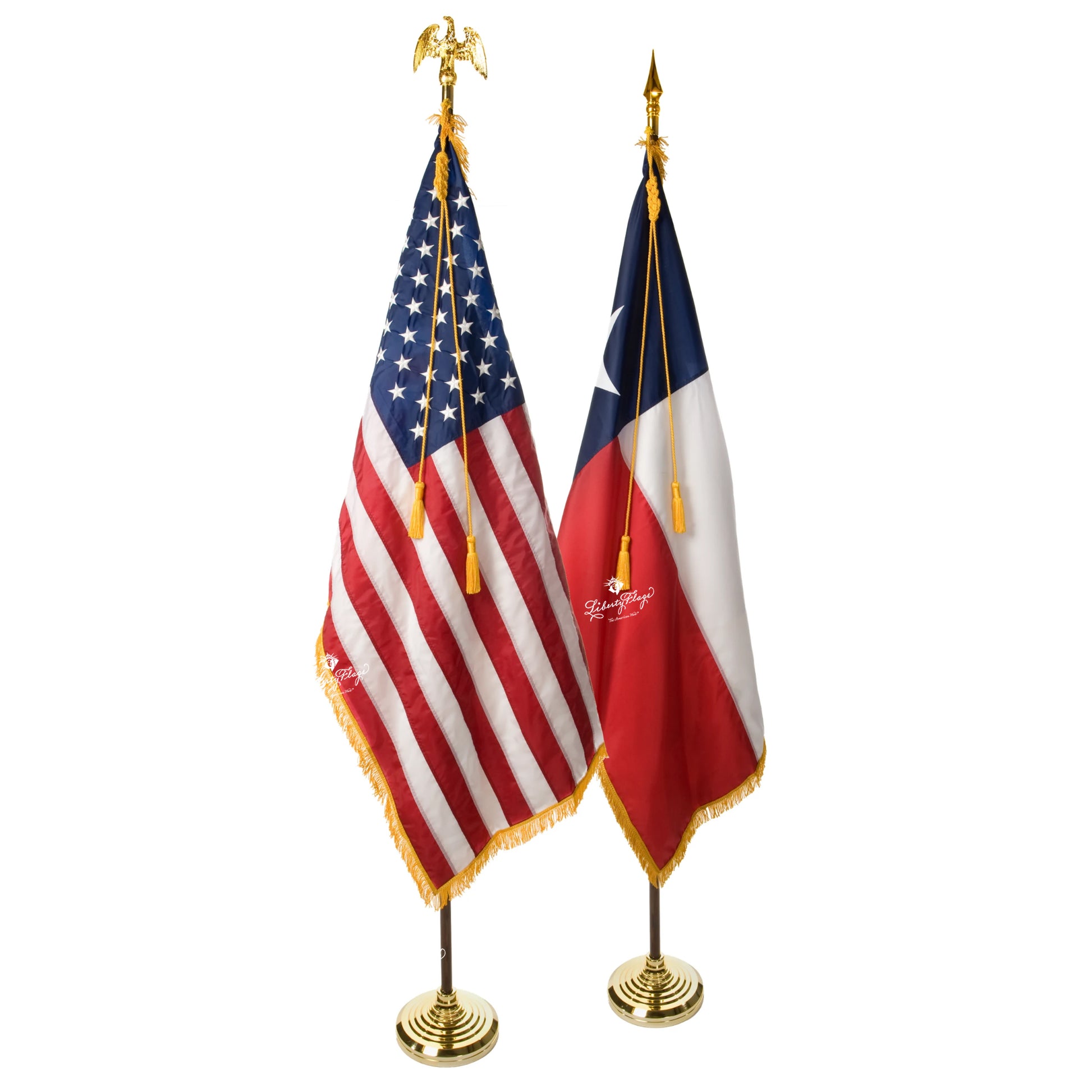 One pair, everything you need! These ceremonial pairs include an American flag and a Texas flag with display hardware including ornaments, braided cords with tassels, furniture-grade finish hardwood poles and attractive floor stands.