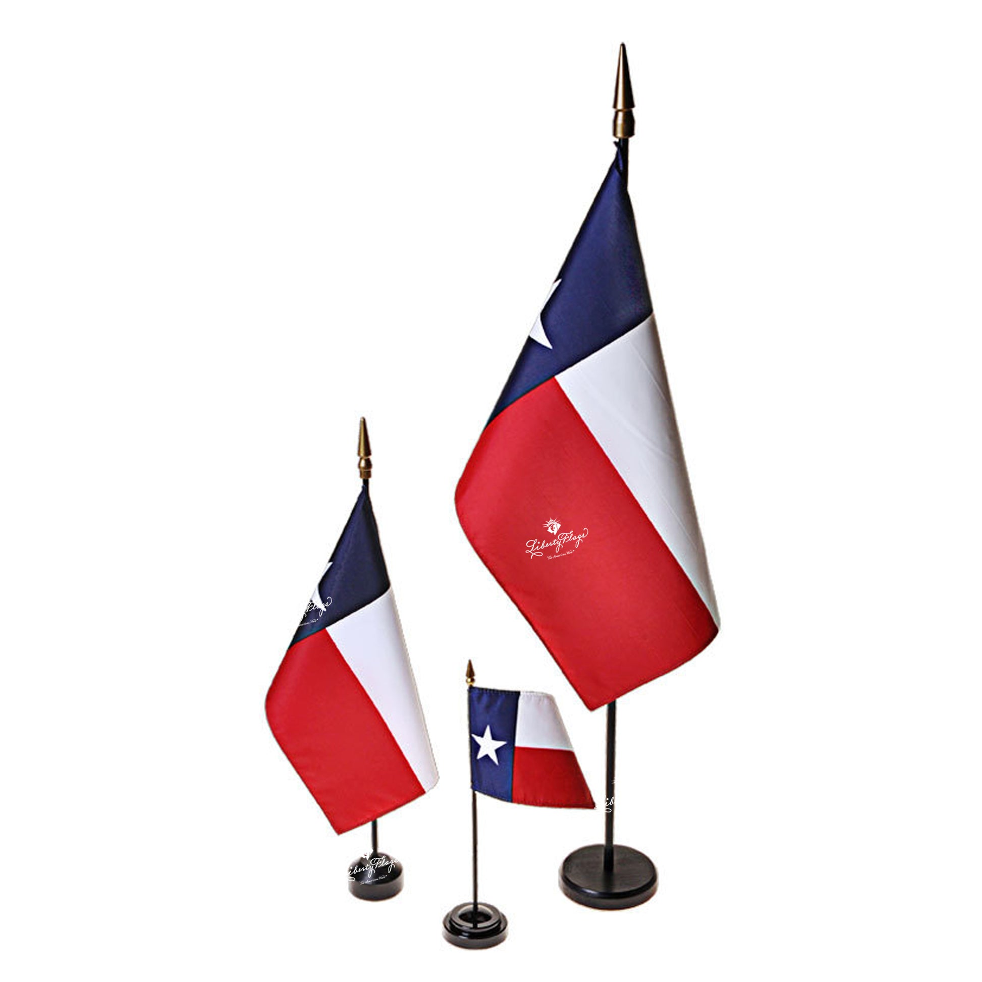 Premium quality hemmed polyester fabric Texas flags are securely stapled to a black dowel staff topped with gilt spear ornament with display base. Note: Size 12”x18” is also suitable for classroom wall mount display.