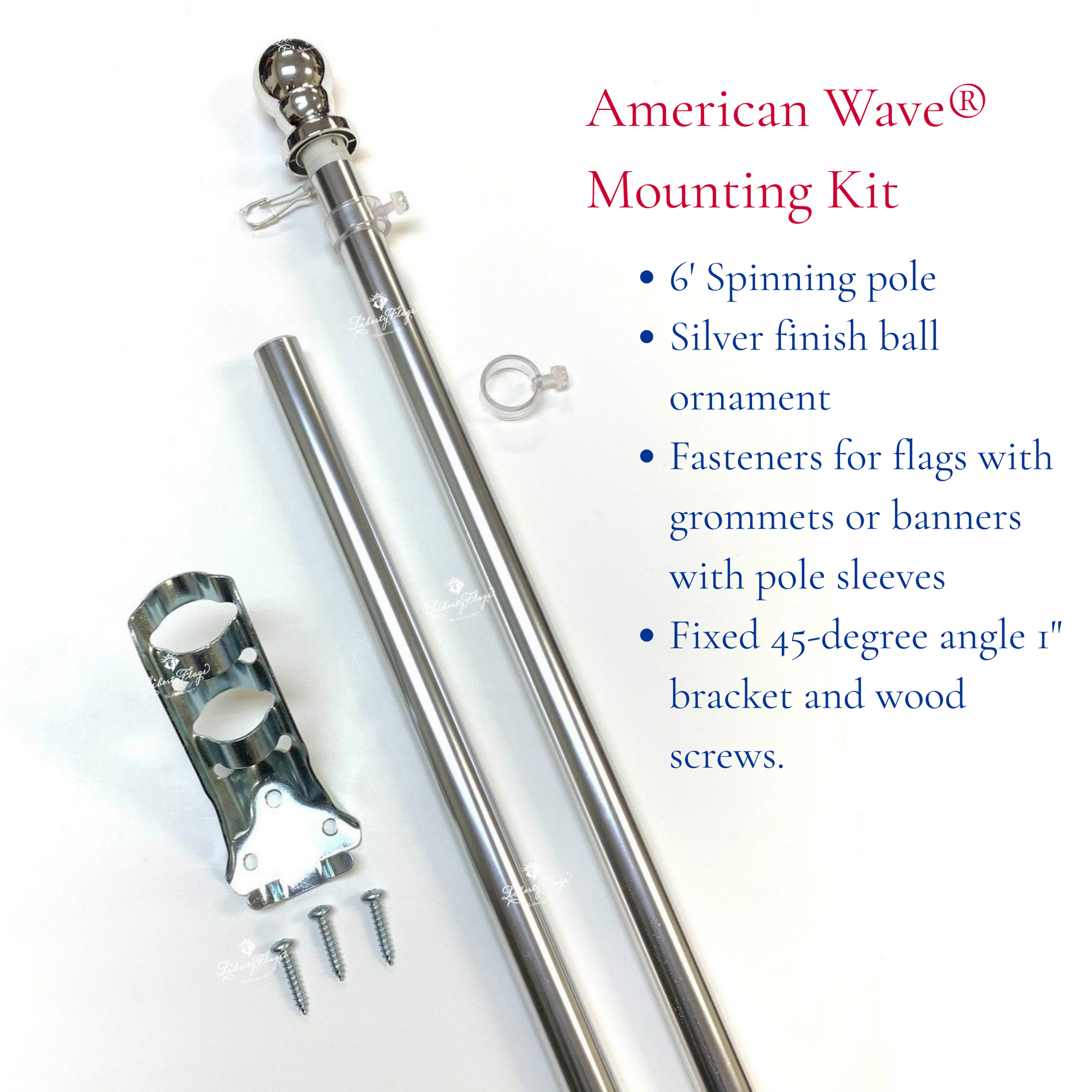 American Wave® Mounting Kits include 6'x1" aluminum spinning pole with silver ball ornament, 2 flag fasteners, and fixed 14-gauge stamped steel 45° angle bracket.