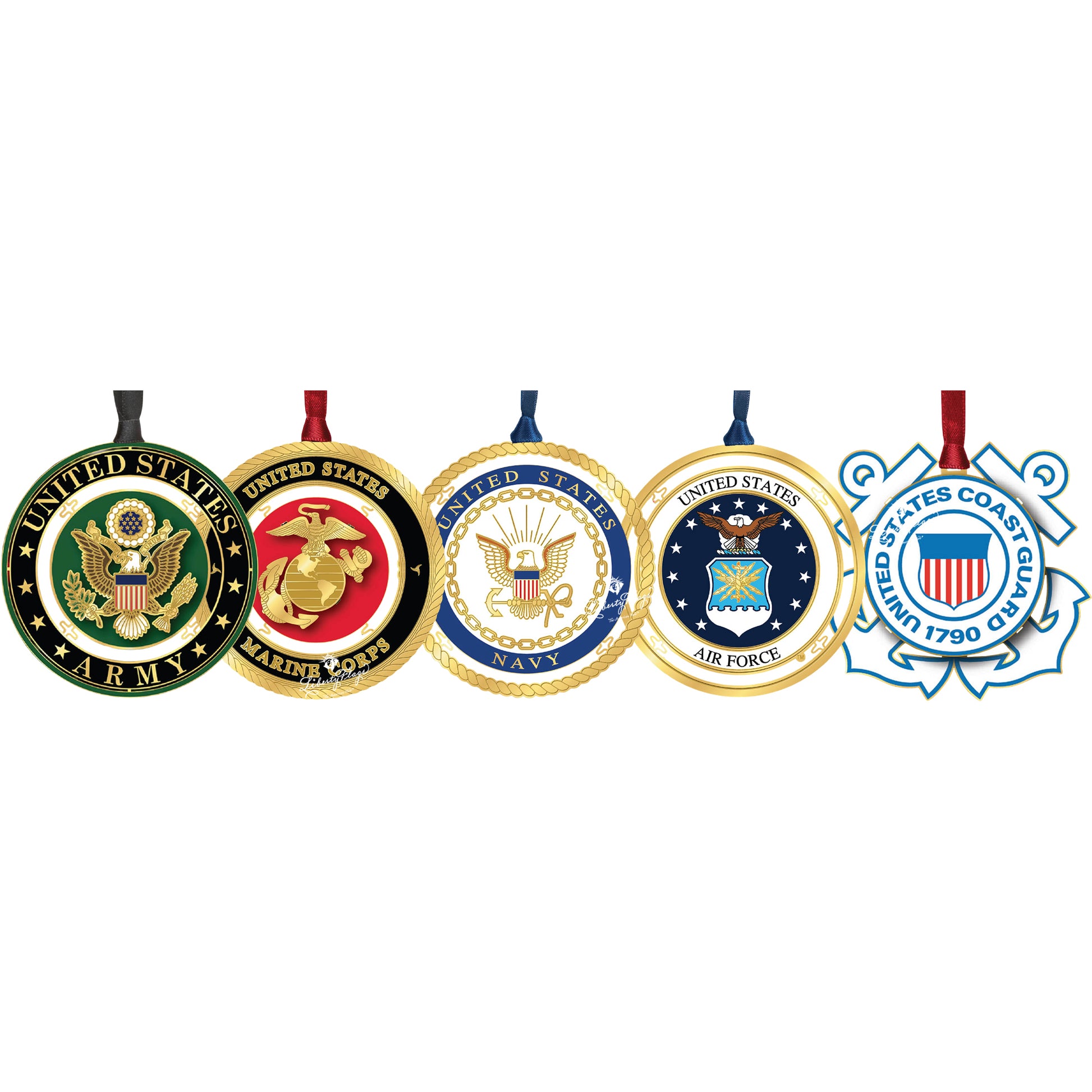 - FIVE ornaments: U.S. Army, Marine Corps, Navy, Air Force, and Coast Guard ornaments in their respective seal designs. This set does not include the U.S. Space Force ornament or the U.S. flag ornament.