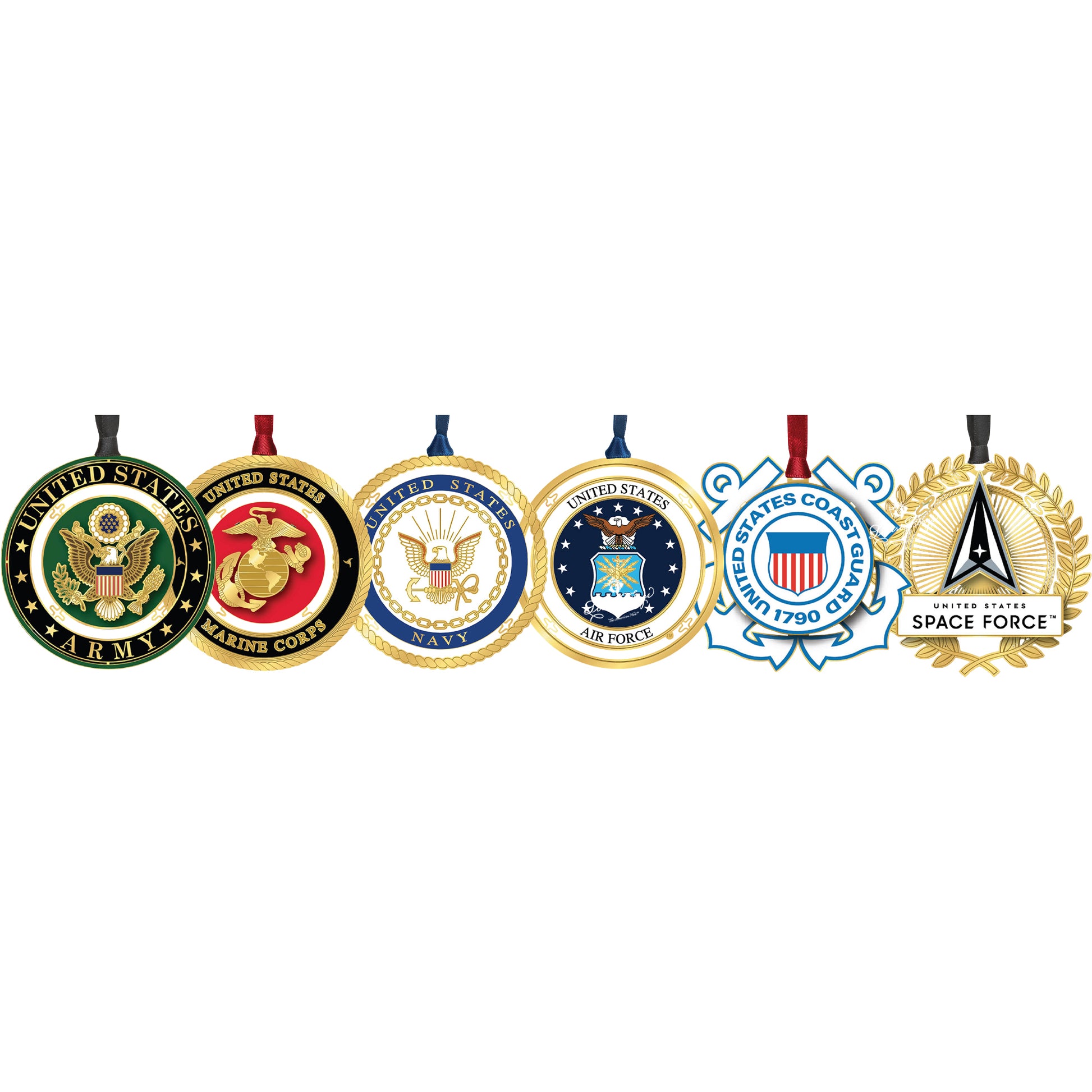 - SIX ornaments: U.S. Army, Marine Corps, Navy, Air Force, and Coast Guard ornaments in their respective seal designs, PLUS either the U.S. flag ornament or the Space Force ornament in its filigree design (Space Force is only available in filigree design at this time).