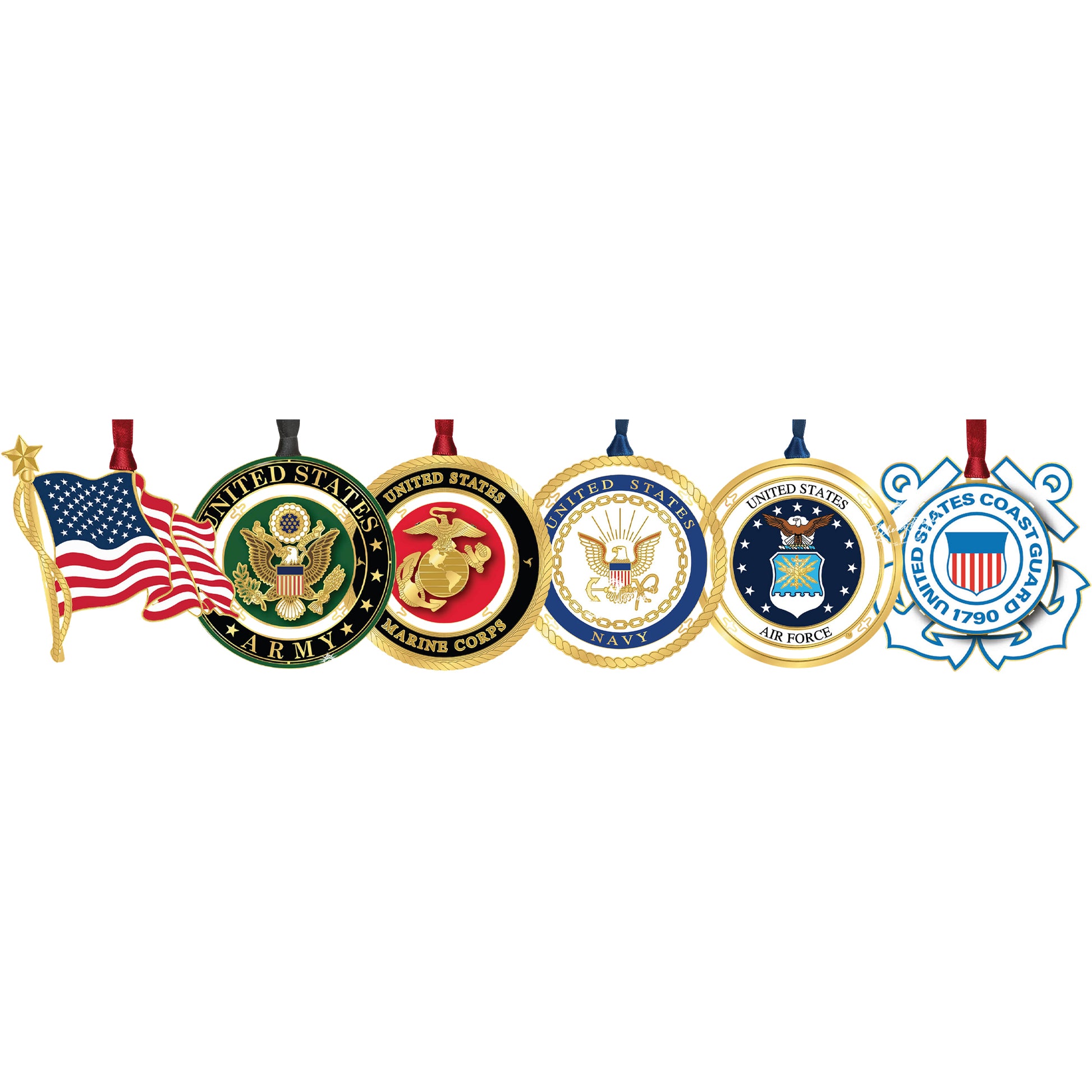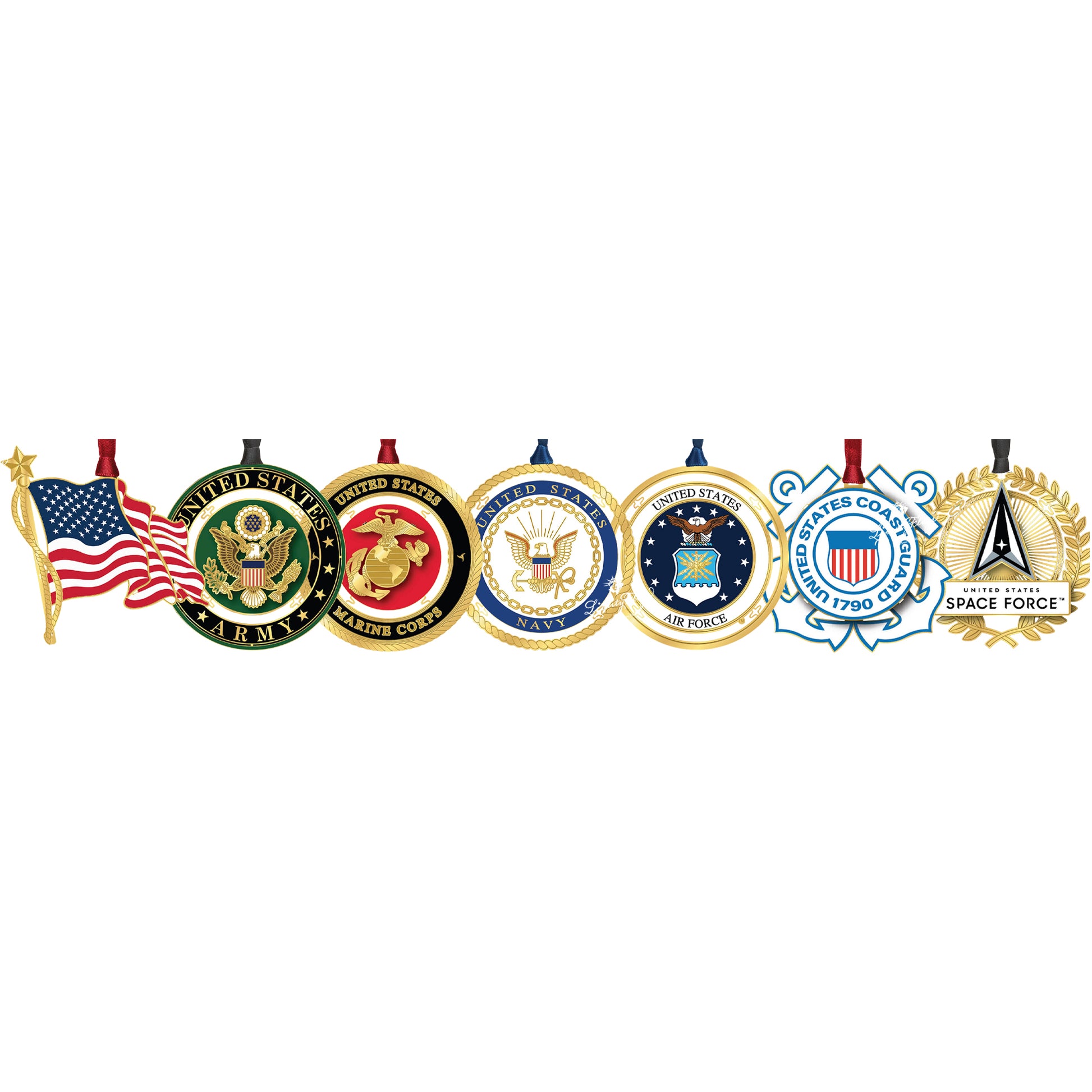 - SEVEN ornaments: One United States flag, along with U.S. Army, Marine Corps, Navy, Air Force, and Coast Guard ornaments in their respective seal designs, plus a Space Force ornament in its filigree design (Space Force is only available in filigree design at this time).
