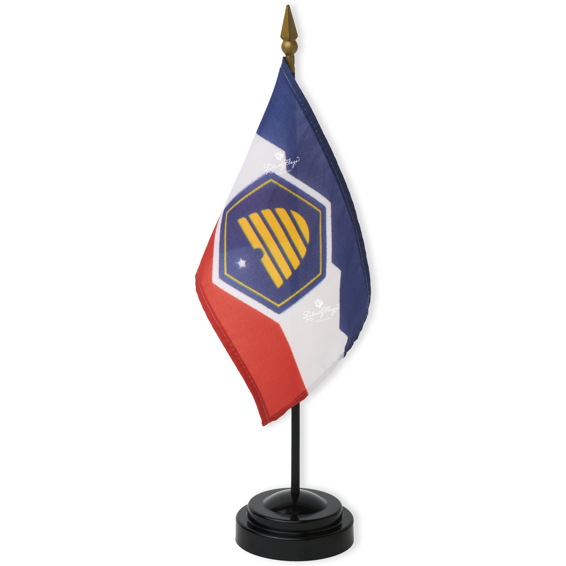 Premium quality hemmed polyester fabric Utah flags are securely stapled to a black dowel staff topped with gilt spear ornament and supplied with black display base.