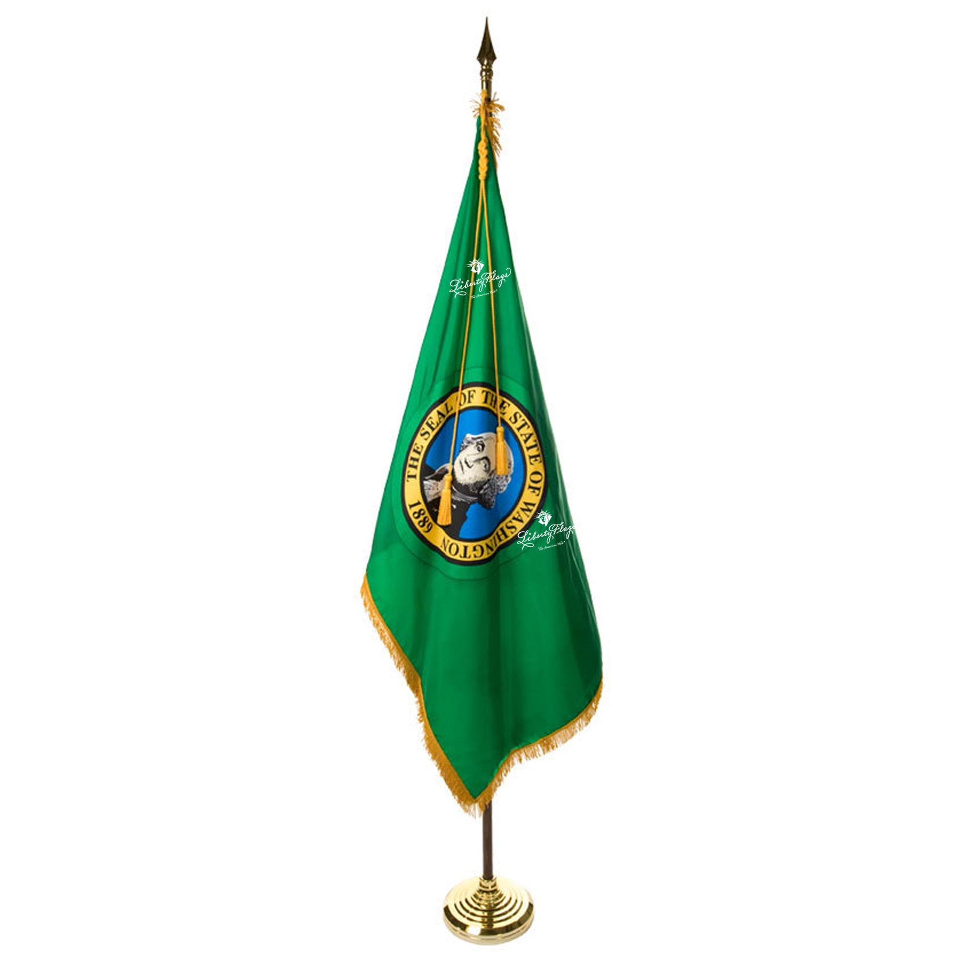 Boardroom to courtroom, set the stage or parade with the finest quality ceremonial Washington flags and display sets available. Ceremonial flags can be purchased alone or with display sets. Two sizes and two set options exist.