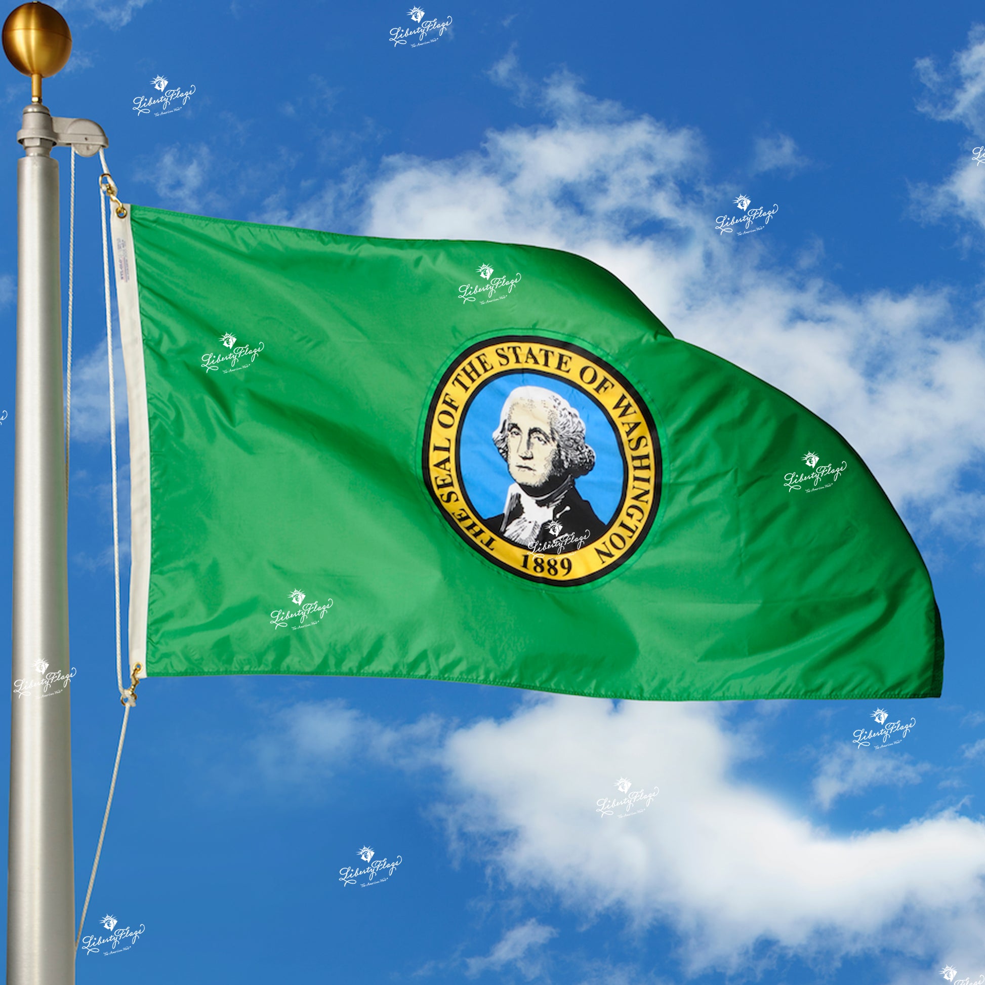 Liberty Flags’ Polyester Washington flag is made from 2x2-ply spun and woven polyester fabric. This fabric is approximately 30% heavier than nylon and the unique fabric weave allows some air to pass through the flag as it flies in the wind. Best performing in high winds and extreme weather.