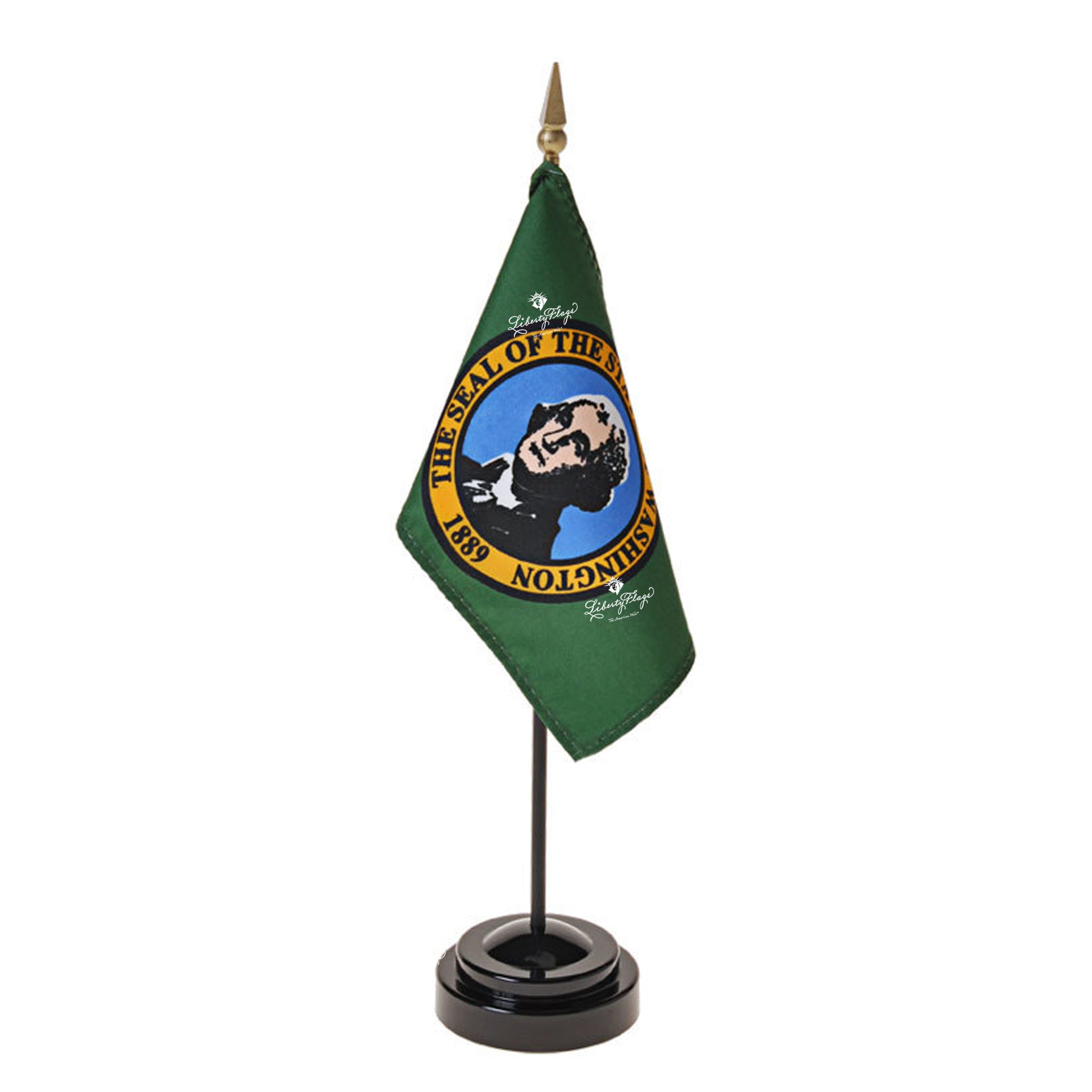 Premium quality hemmed polyester fabric Washington flags are securely stapled to a black dowel staff topped with gilt spear ornament and supplied with black display base.